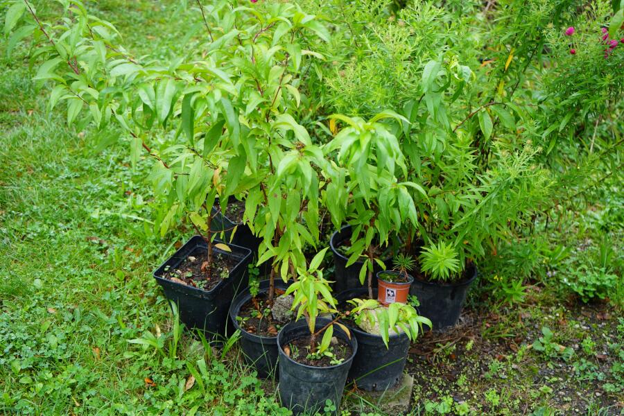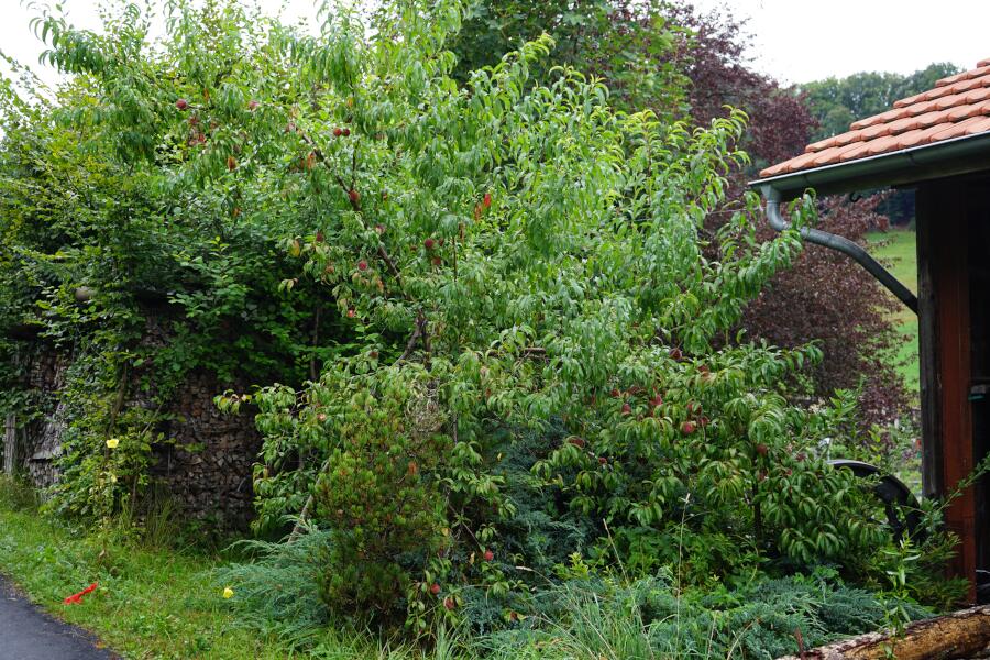 Vor über zehn Jahren begann Elfred also aus den Steinen Bäume zu ziehen und sie an verschiedenen Stellen auf seinem Grundstück zu pflanzen. Die meisten Steine (die Samen von Steinobst) keimten jedoch aus dem Kompost, den er im Garten verteilte. Sie wuchsen genau an der Stelle, wo sie sich entschieden haben, das Licht der Welt zu erblicken (deshalb halbwild) und wurden über die Jahre zu schönen Bäumen heran. Die Gartengestaltung passte sich dann den Neuankömmlingen an. An machen Jahren brechen die Äste ab, wie so viele Früchte an ihnen hängen. Das Land, auf dem sich die Pfirsiche befinden ist ein Nordhang und eher bekannt für seine kühlen Temperaturen und den langen Frost im Frühjahr, wärend es auf der Südseite schon taut und zu Wachsen anfängt. Er spritzt keine synthetischen Pestizide oder Kupferpräparate, um ernten zu können. Elfred braucht ab und zu etwas EM, Urin und Kompost und die Bäume gedeihen prächtig.