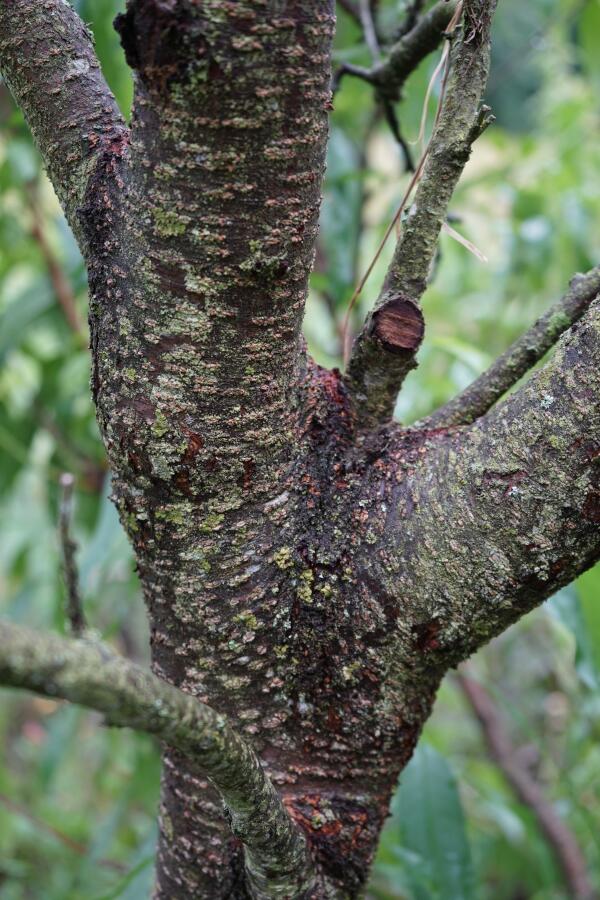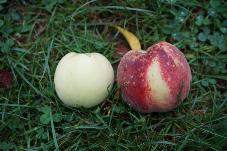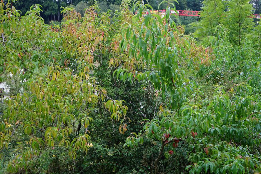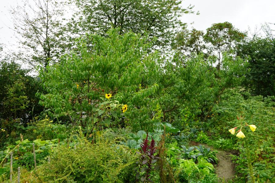 Jene Früchte sind nicht immer perfekt, haben manchmal Flecken und einige Zweige sind von Monilia befallen, doch die Bäume wirken dennoch gesund und robust. Kräuselkrankheit ist vorhanden, aber scheint in diesem Jahr nicht wirklich zum Problem zu werden. Diese Pflanzen sind wirklich standortangepasst. Sie keimten und wuchsen genau an der Stelle, die sie für richtig empfanden. Elfred pflanzt sie nur um, wenn der Platz wirklich ungeeignet ist oder einfach zuviele Bäume aus dem Kompost keimen. Für den erfolgreichen Anbau sind auch hier die Mikroklimazonen direkt um den Baum wichtiger, als das Klima in der Region. Auch die Qualität des Bodens ist massgebend für die Grösse und Güte der Früchte.