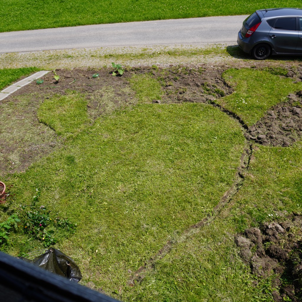 Jedenfalls heizen wir mit Holz, die Wohnung hat eine Speisekammer und das Beste: Eine Grasfläche, die gewisse Menschen schon in einen Garten verwandelt haben. Wer das wohl war?